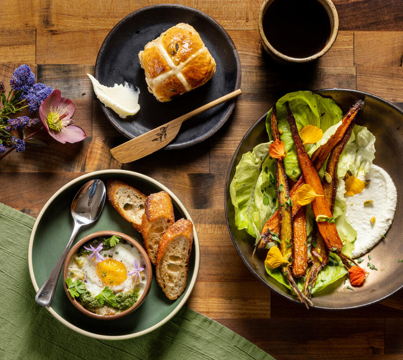 Spring brunch dishes including baked eggs en cocotte, roasted carrots with whipped feta, and sweet hot cross buns.