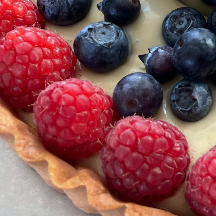 Shortbread crust with smooth pastry cream and fresh fruit, plus a dark chocolate tart with sea salt.